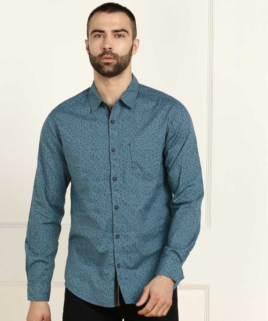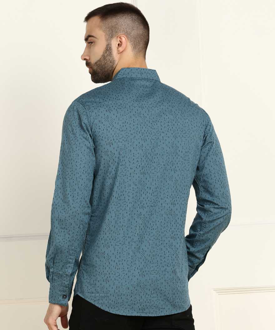 Navy Blue With Green Leaves Print Full Sleeves Shirt