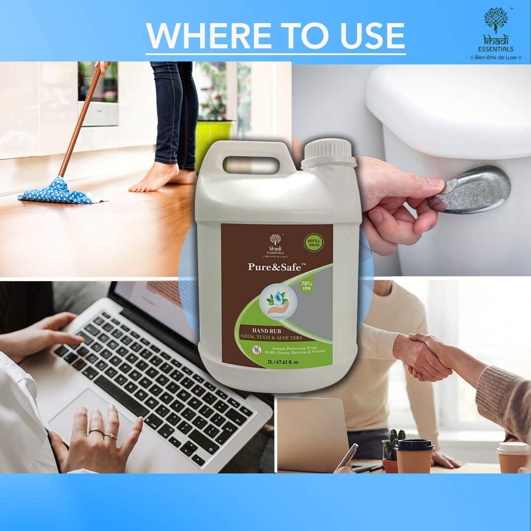 Best used for effective sanitization after touching public surfaces and effective and germ-free cleaning of contaminated surfaces. With Ethyl Alcohol (ENA) 70%, Neem Extracts, Tulsi Extracts, Aloe Vera Extract & Glycerine
