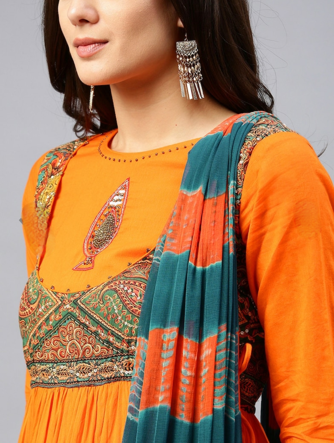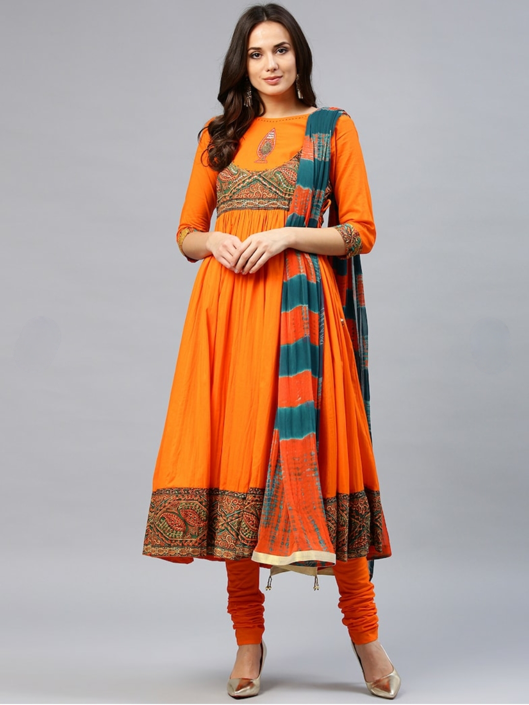Orange yoke design kurta with churidar and dupatta