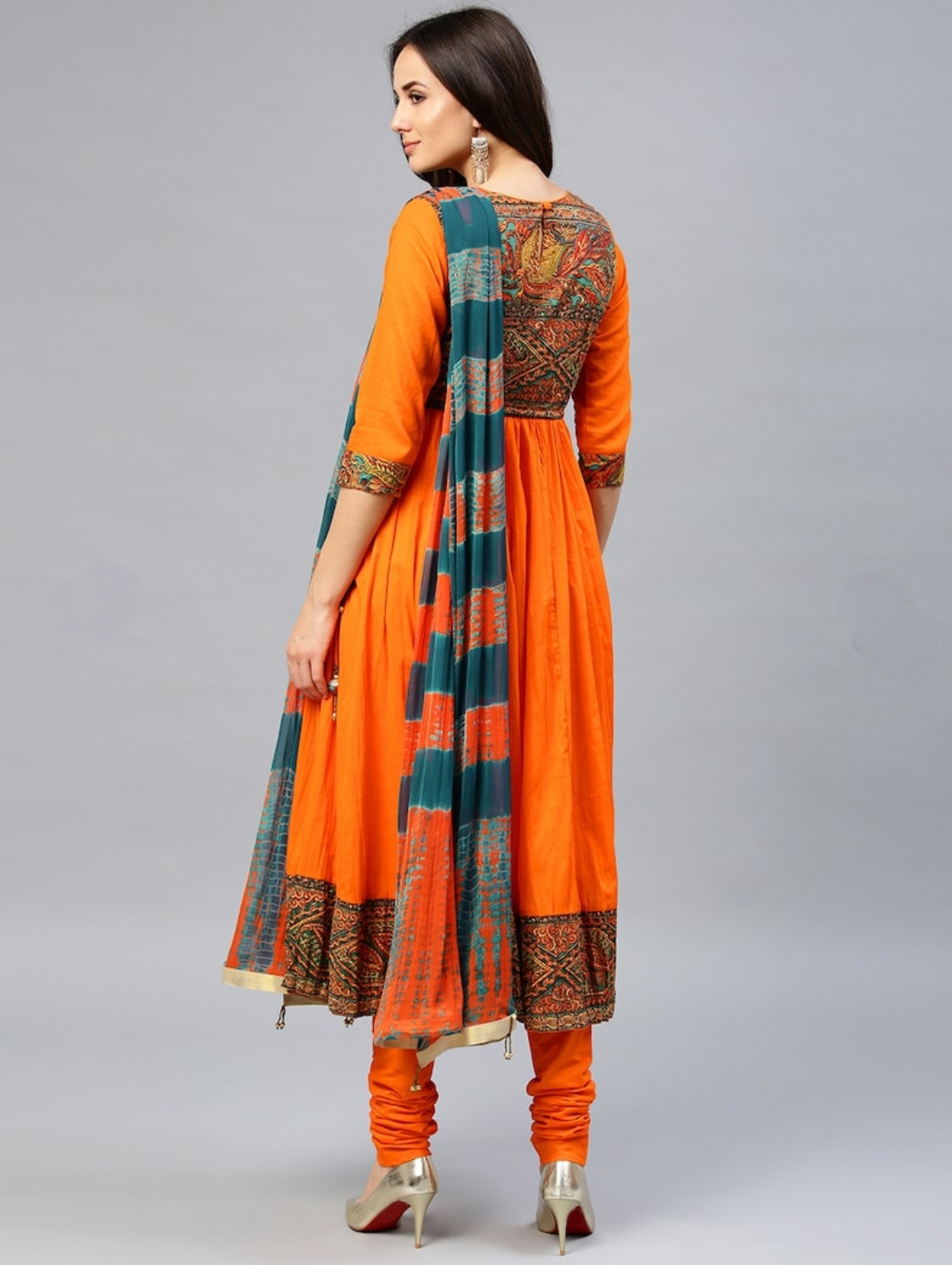 Orange printed Anarkali calf length kurta, has a round neck, three-quarter sleeves