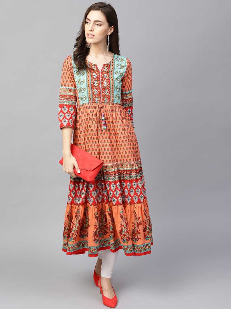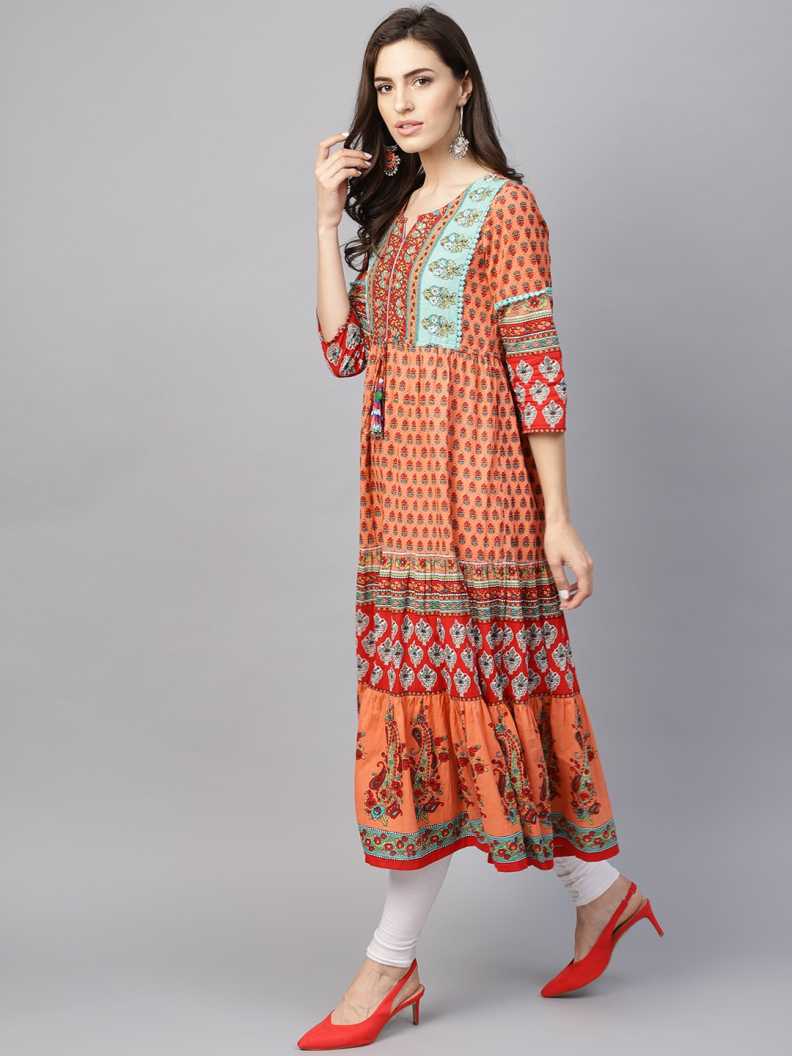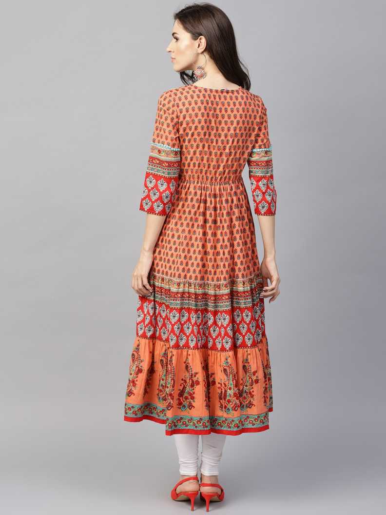 Women Printed Cotton Blend Flared Kurta (Orange)