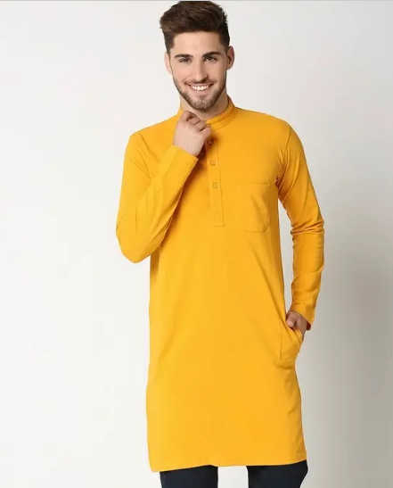 Flaunt a cool #OOTD with this Men's Solid Cotton Mid Kurta. Partner this yellow kurta with a pair of cropped trousers and loafers for a refined look.