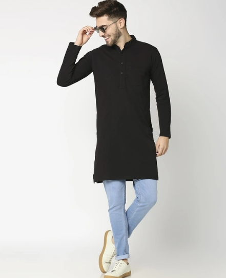 Flaunt a cool #OOTD with this Men's Solid Cotton Mid Kurta. Team this black kurta with a pair of chinos, smart loafers and a jacket for a fashionable look.