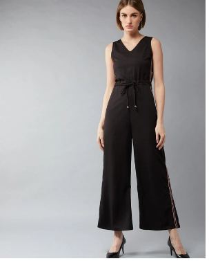 Black solid straight leg jumpsuit, has a V-neck and is sleeveless, has a drawstring detail at waist and a side twill tape detail, has a back zip closure