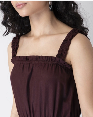 Equal parts chic and classy, slip into this wine strappy jumpsuit to move from 9 to 9 in style. It features frills on the neck and the straps. Style Tip: Pair the jumpsuit with a blazer for the day and switch up your look with a clutch and heels for ...