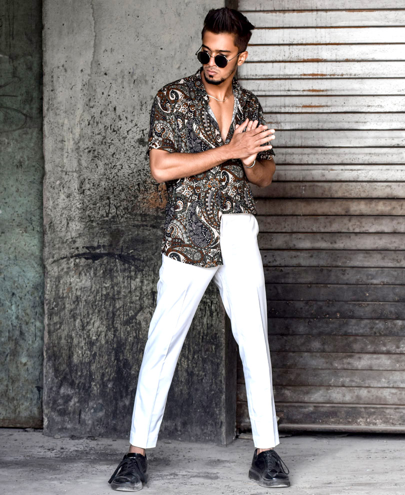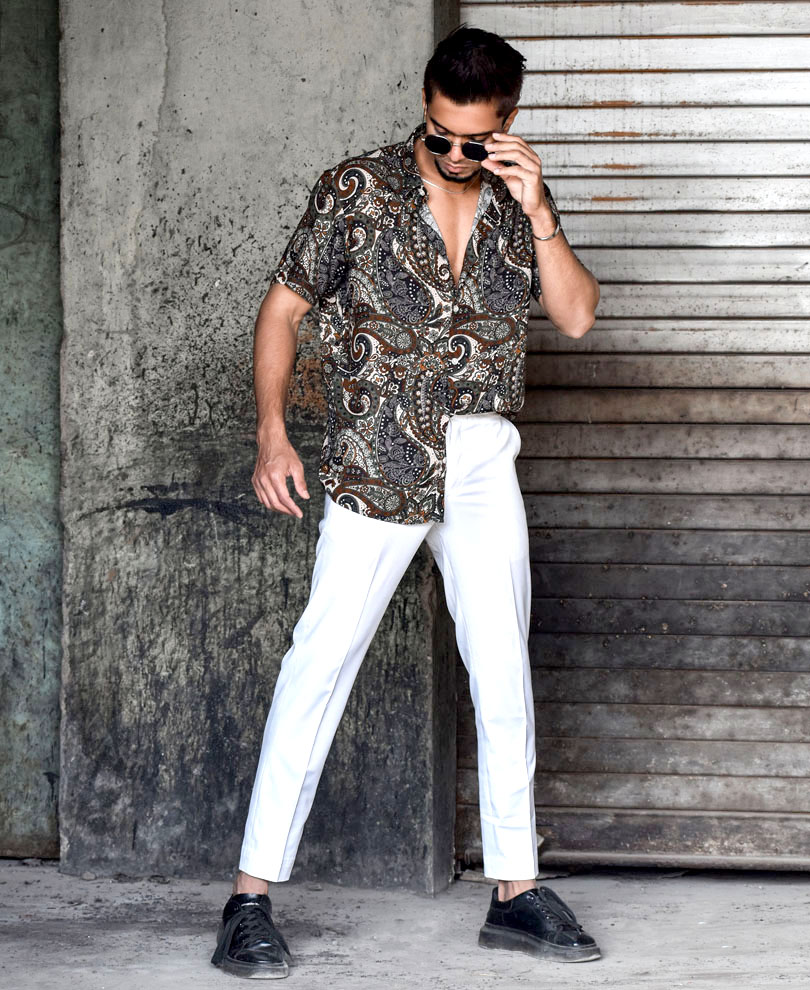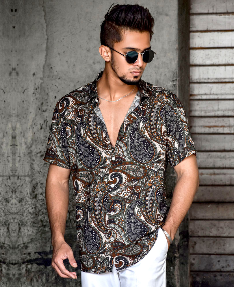 Cream With Black Flowers Printed Half Sleeves Shirt
