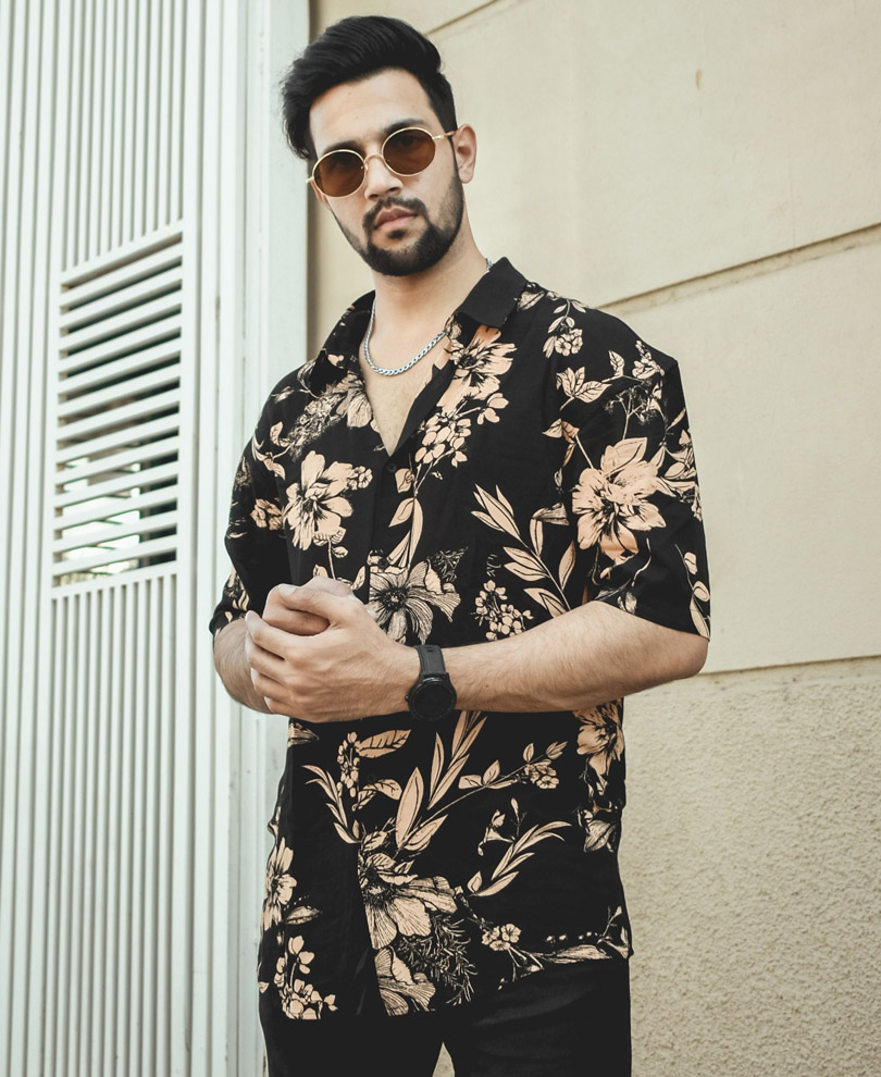 Black with Cream Flowers Print Oversize Drop Shoulder Shirt