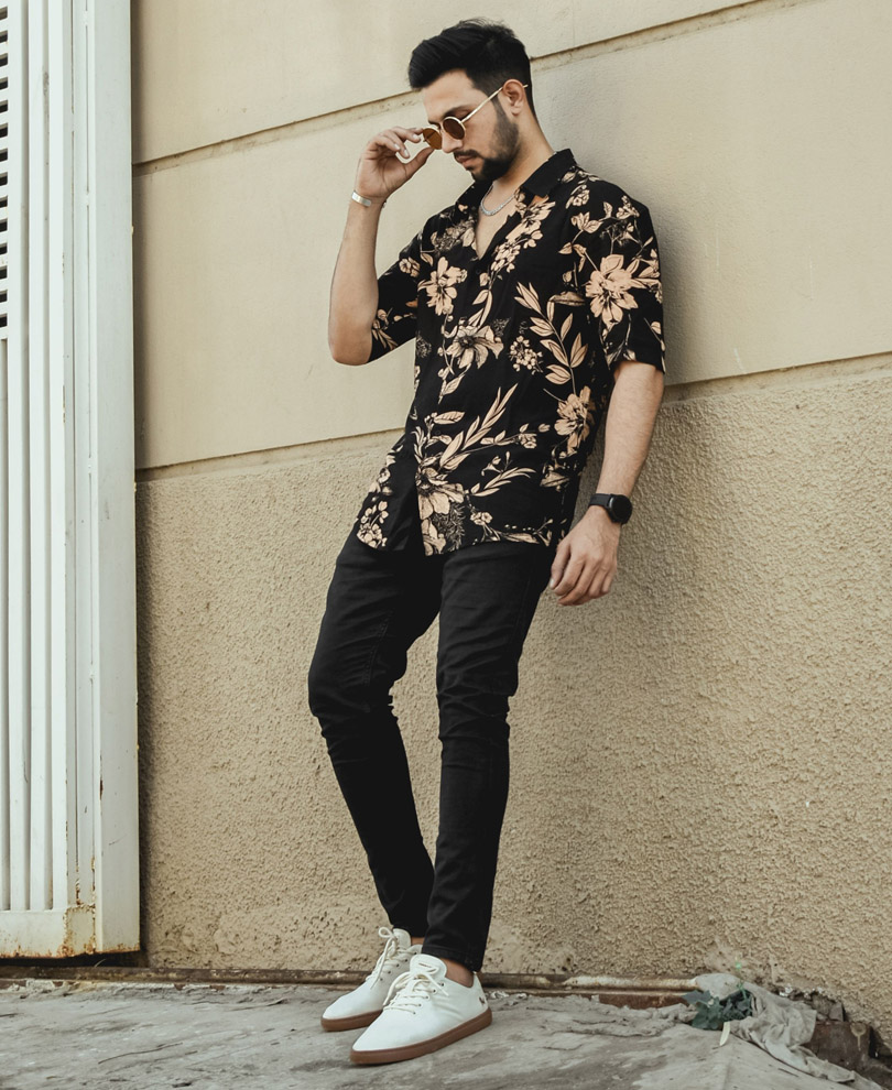 Cream With Black Flowers Printed Half Sleeves Shirt