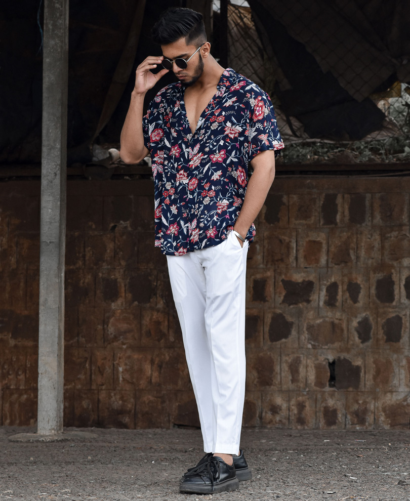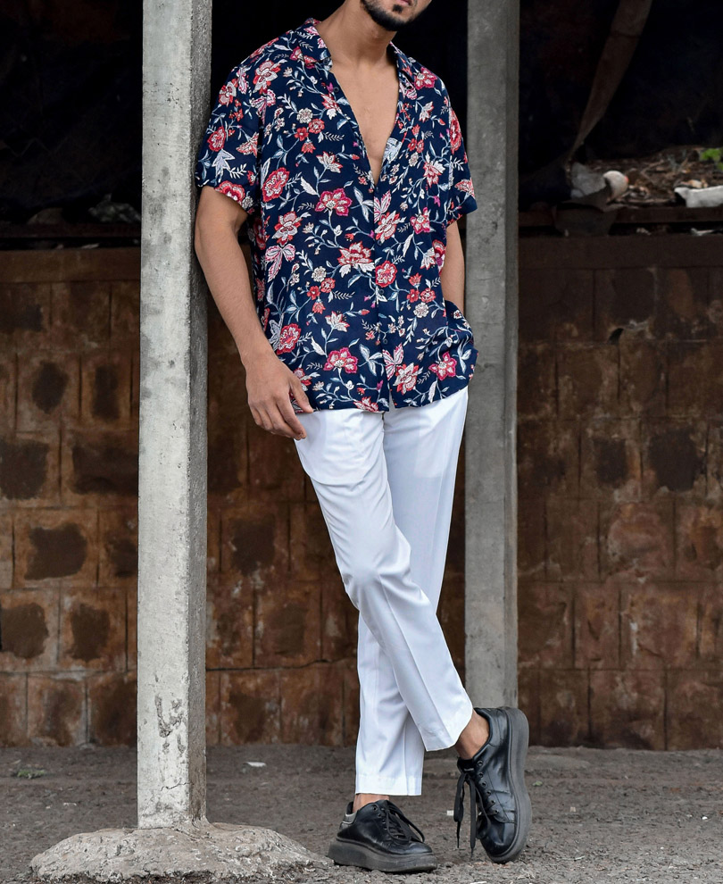Navy Blue Floral Print Half Sleeves Shirt