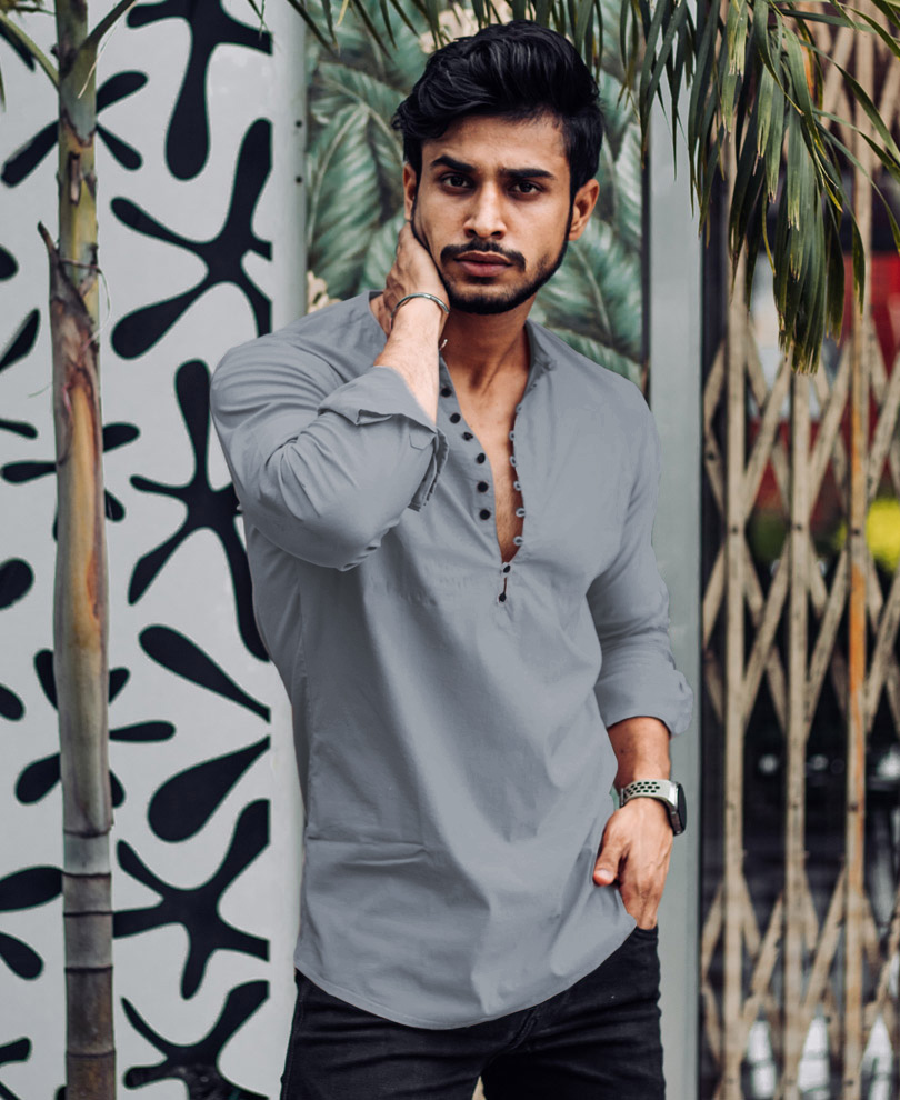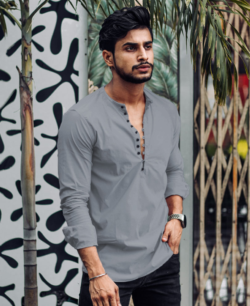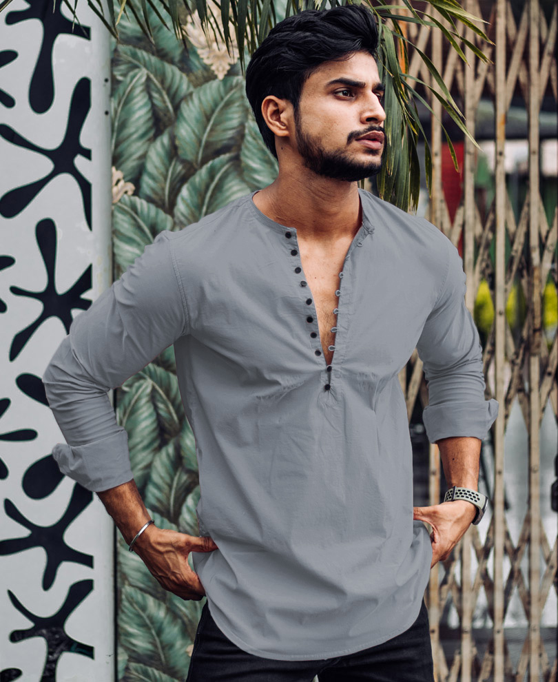 Grey Stretch Checks Kurta Full Sleeves Shirt