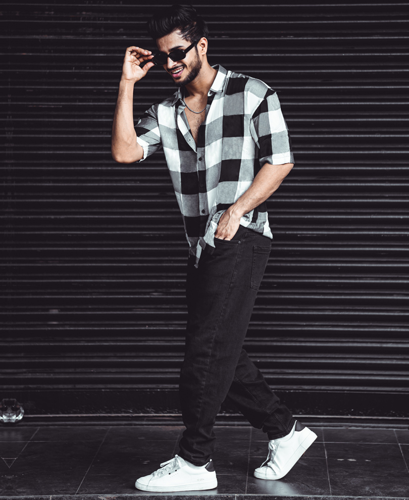 White and Black Check Print Half Sleeves Shirt