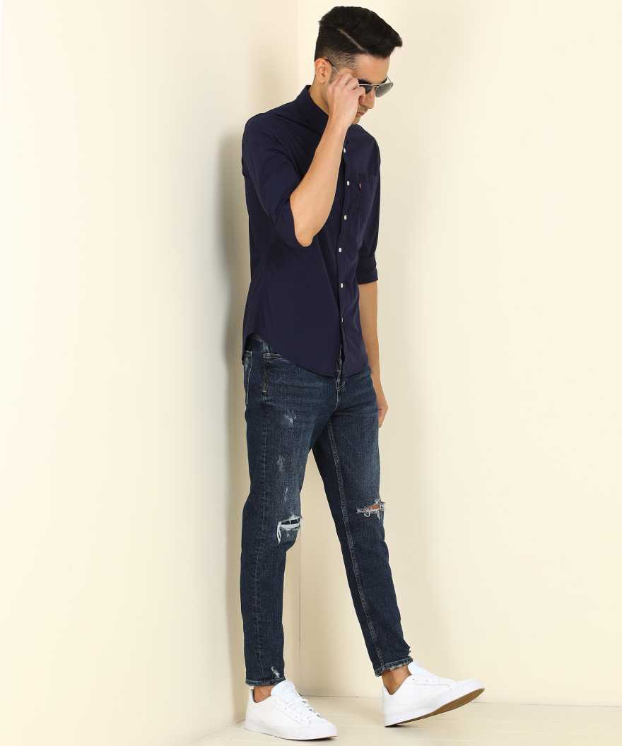 Navy Blue With Green Leaves Print Full Sleeves Shirt